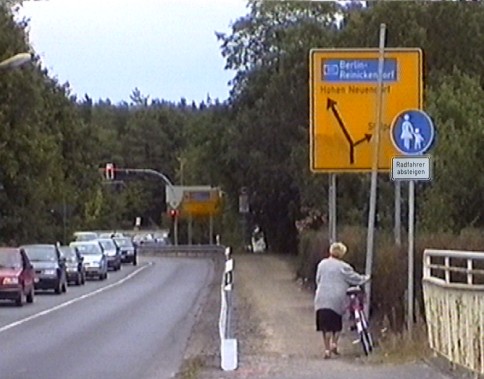 Der geneigte Radfahrer kommt aus der Ortschaft Hennigsdorf und will auf der Ruppiner Str. nach Berlin/ Heiligensee weiterradeln. Nachdem die Brücke über den Oder-Havel-Kanal erklommen ist und man sich auf die kurze Abfahrt freut, fällt der Blick auf zwei Verkehrszeichen............: Das blaue Fusswegschild bedeutet unzweifelhaft das die strammen Waden eines in die Pedale tretenden Radfahrers hier nicht erwünscht sind und der Radweg hier zu Ende ist. Doch was soll das zweite Schild darunter bedeuten? "Radfahrer absteigen!"? Darf man hier nicht auf die Strasse wechseln, was ohnehin durch eine Leitplanke erschwert ist? Man soll also das Rad schieben......aber bis wohin??? Ein Schild mit der Aufschrift: "Radfahrer aufsteigen!" ist nirgends zu sehen......................! Einen Schildervorschlag für die Hennigsdorfer Verkehrsplaner habe Ich noch: Wie wäre es mit einem Schild: "Autofahrer aussteigen und schieben!"?